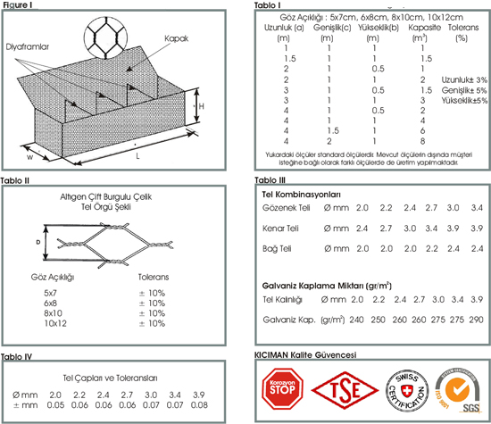 Gabion Sepetlerin imalinde kullanılan bütün teller ve bağ tellerinin 2 kopma dayanımı 38-55kg/mm ’dir. Teller kopma mukavemetleri ve tel çap toleransları olarak BS102/80’e uygundur. Yukardaki değerler tel örülmeden önceki değerlerdir. Toleranslar için Bkz.Tablo IV. Tellerin kopma anındaki uzama miktarı min.%12dir, galvaniz kaplaması BS443/82 ve EN10244-2’ye uygundur.